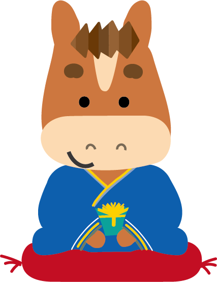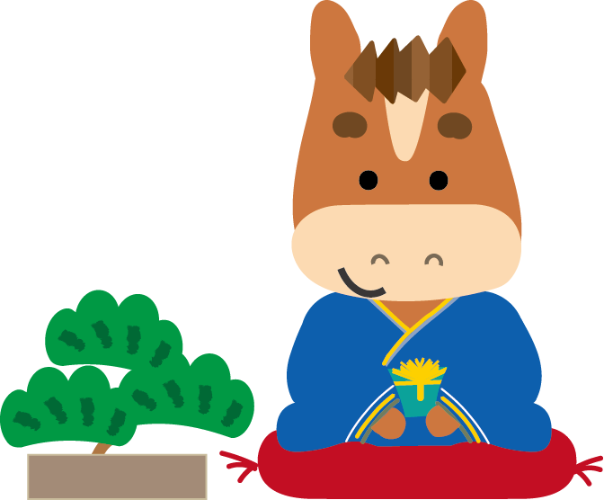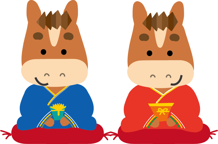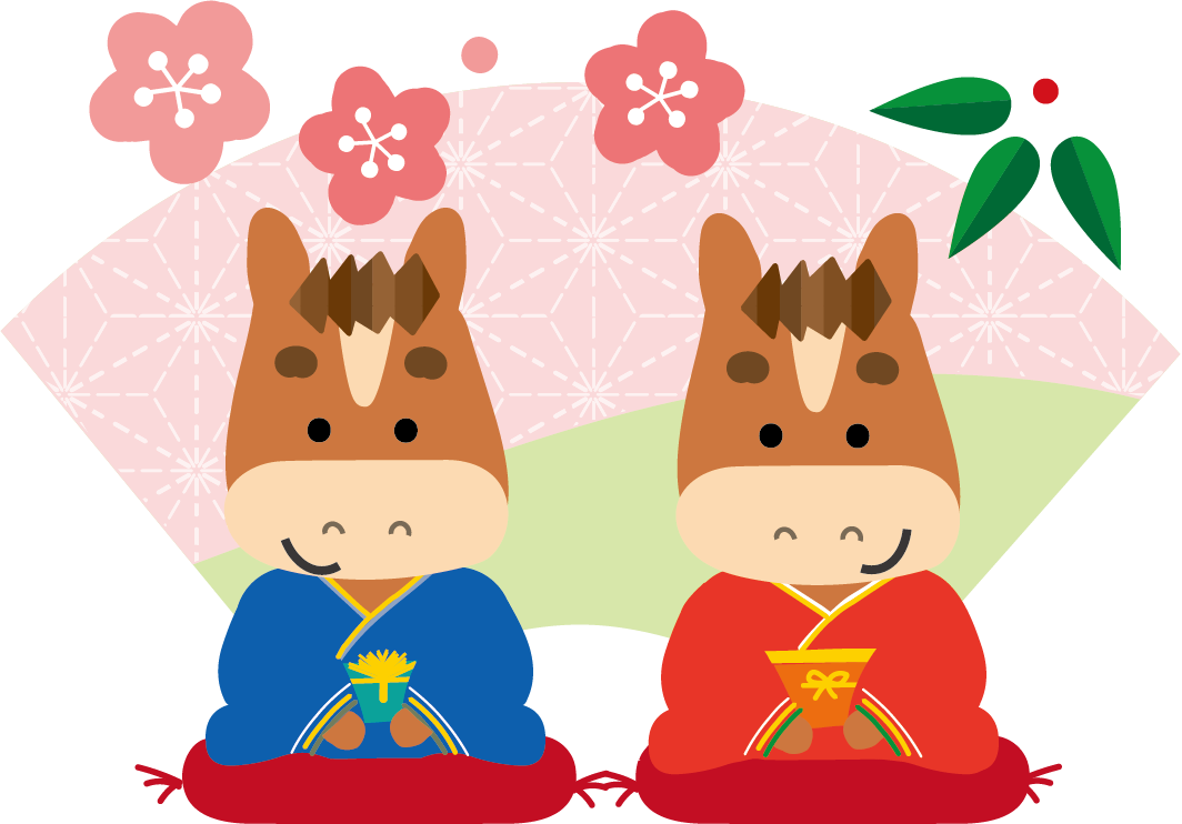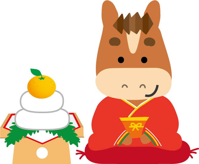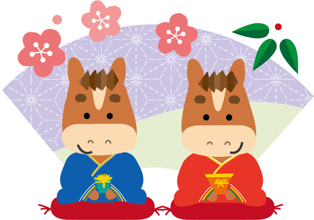 かわいい干支午(うま)馬のイラストが無料(登録不要)でダウンロード出来ます。年賀状の挿絵としてお使いいただけます。2026年 年賀状印刷用素材(郵便葉書)としてのご使用は個人様はもちろん法人・ビジネス用でも無料でご使用頂けます。ご使用のさいは利用規約を読まれてご使用くださいませ。年賀状印刷用イラスト素材は各画像の上でクリック【 別枠で開いた大きな画像 】をダウンロードしてご使用ください。