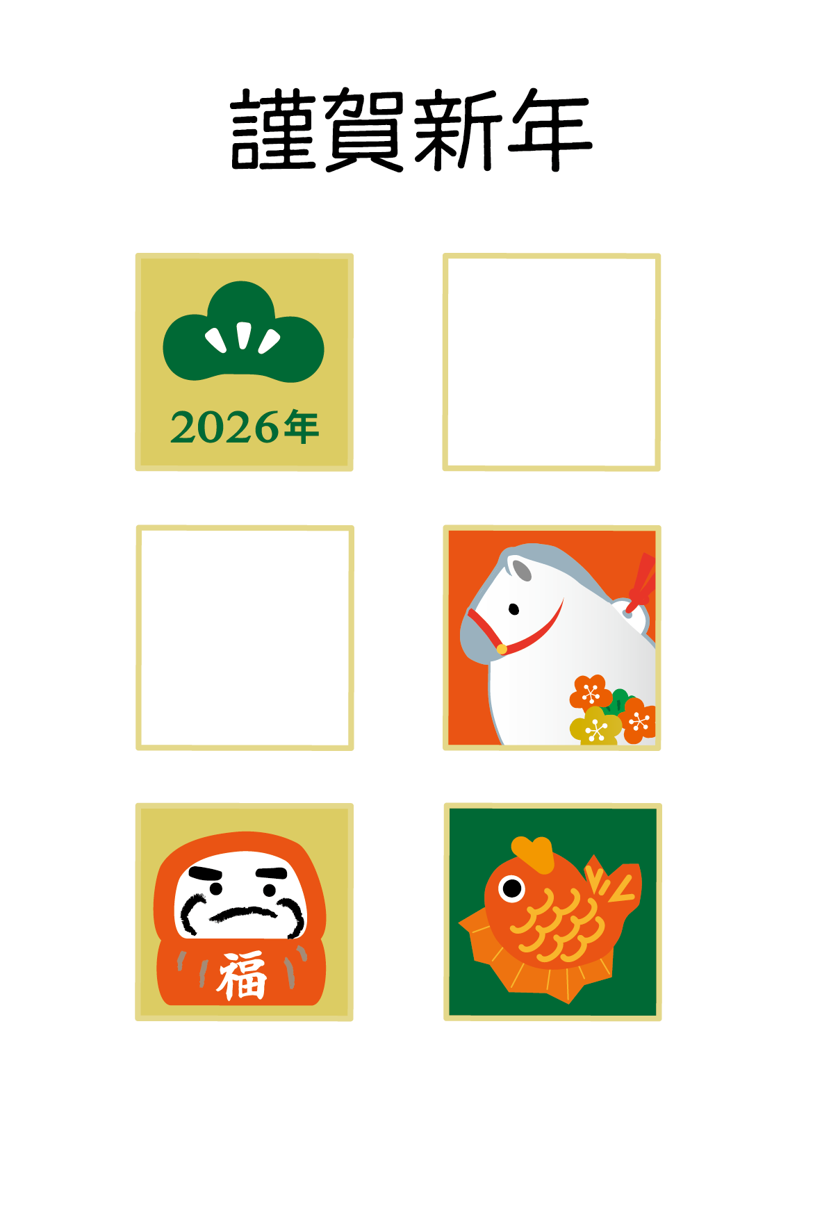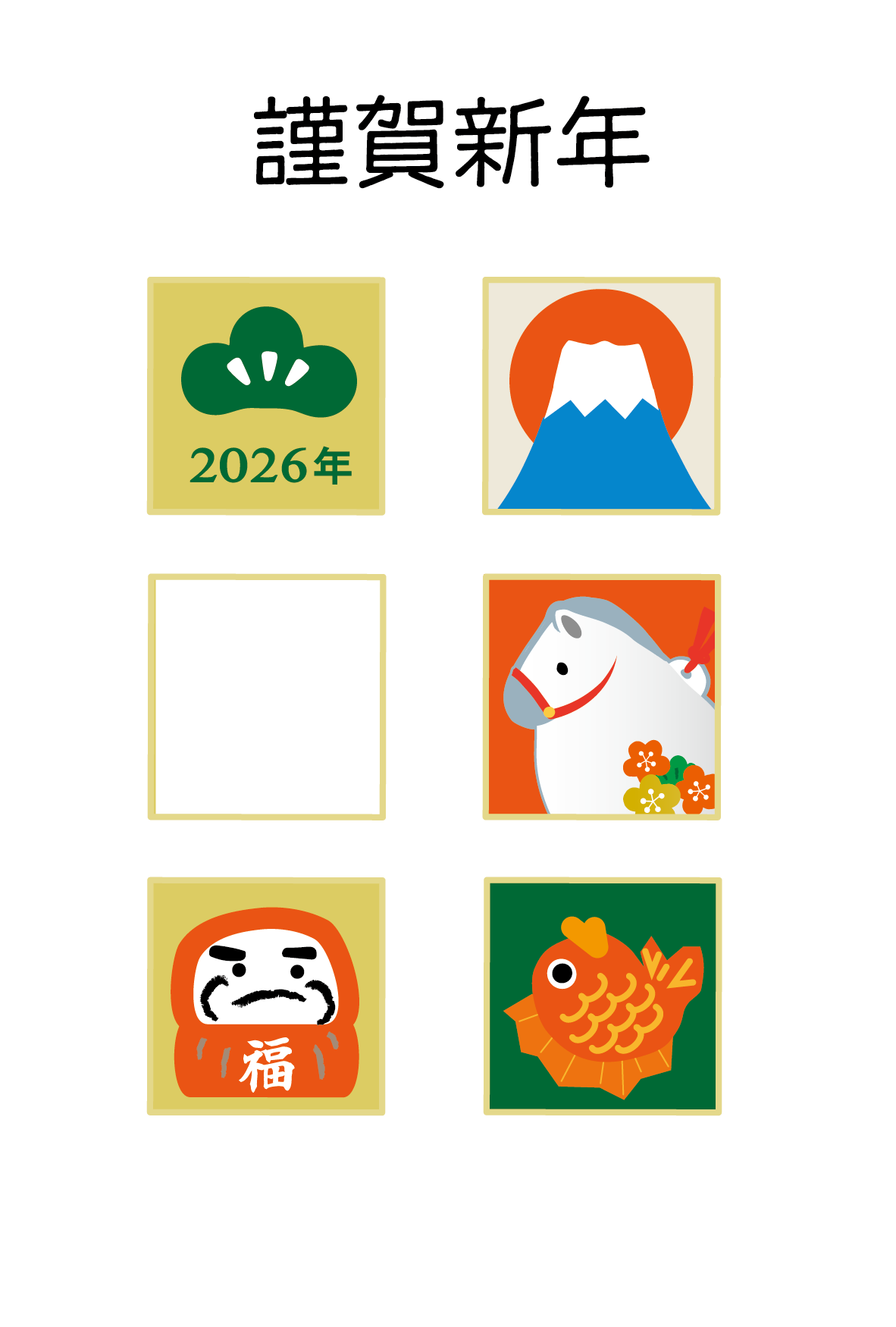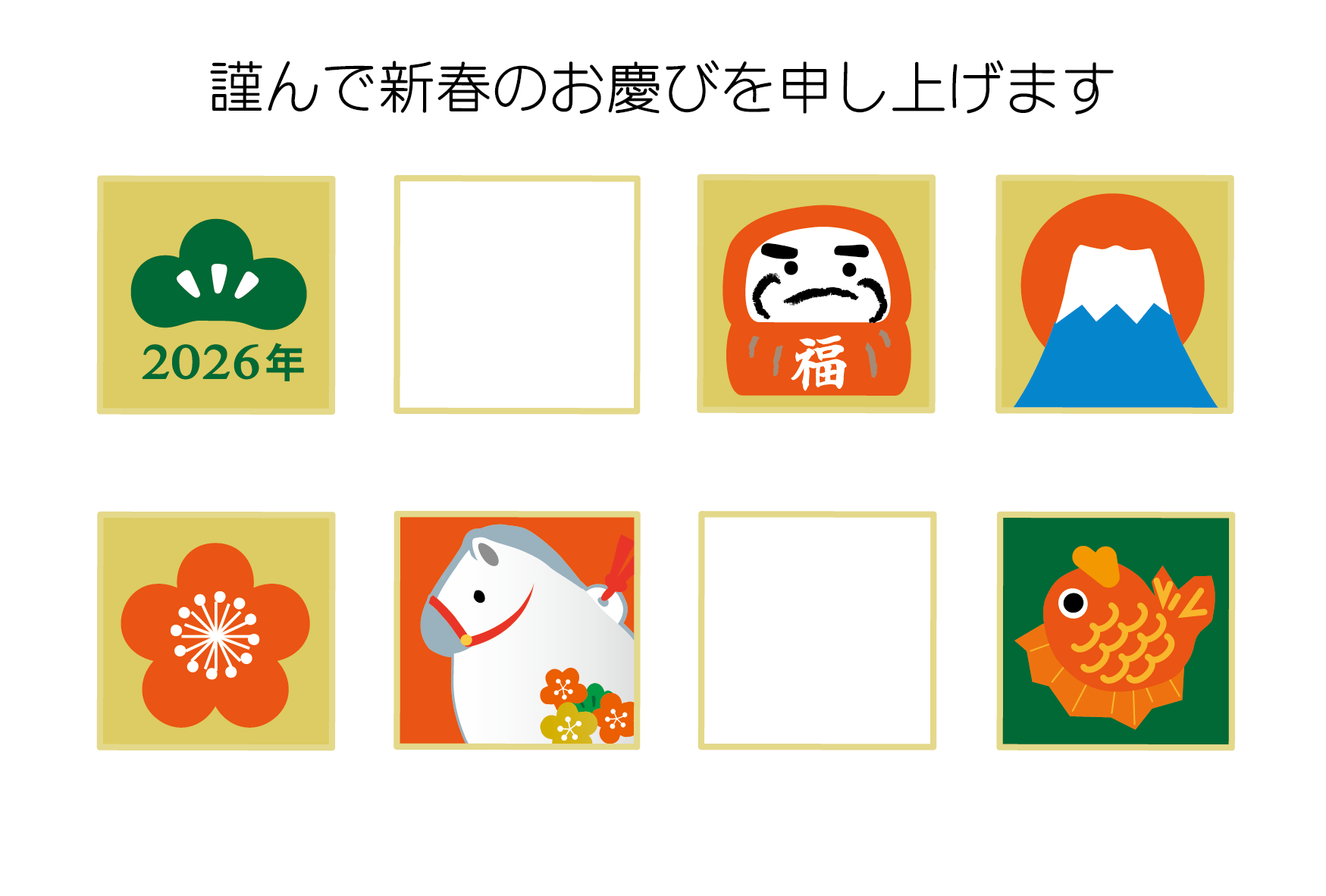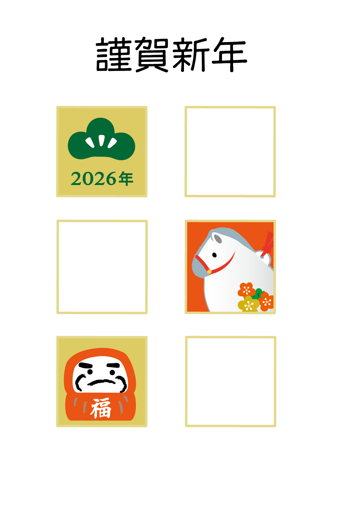 写真を入れて作成できるかわいい干支午年うまのイラストのフォト フレーム年賀状デザインテンプレートが無料(登録不要)でダウンロード出来ます。2026年年賀状印刷用素材(郵便葉書)としてのご使用は個人様はもちろん法人・ビジネス用でも無料でご使用頂けます。ご使用のさいは利用規約を読まれてご使用くださいませ。年賀状印刷用写真フレーム素材は各画像の上でクリック【 別枠で開いた大きな画像 】をダウンロードしてご使用ください。
