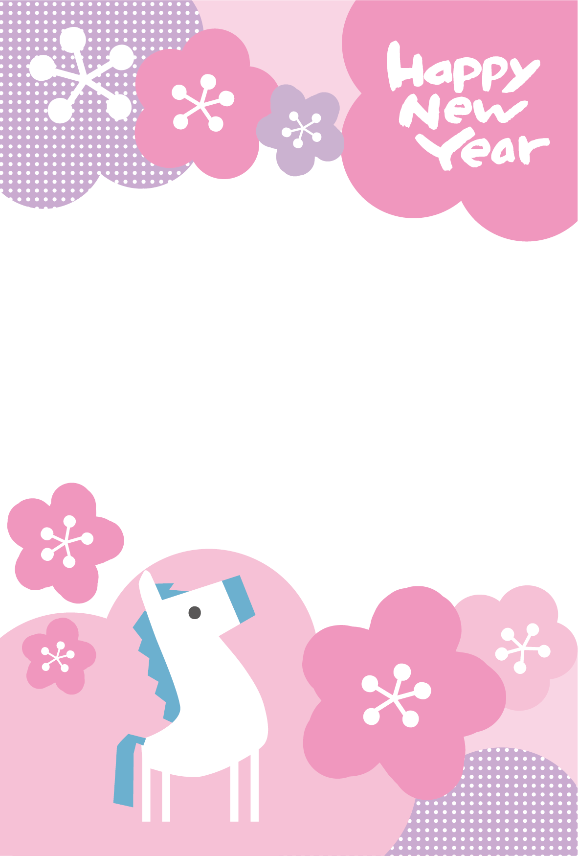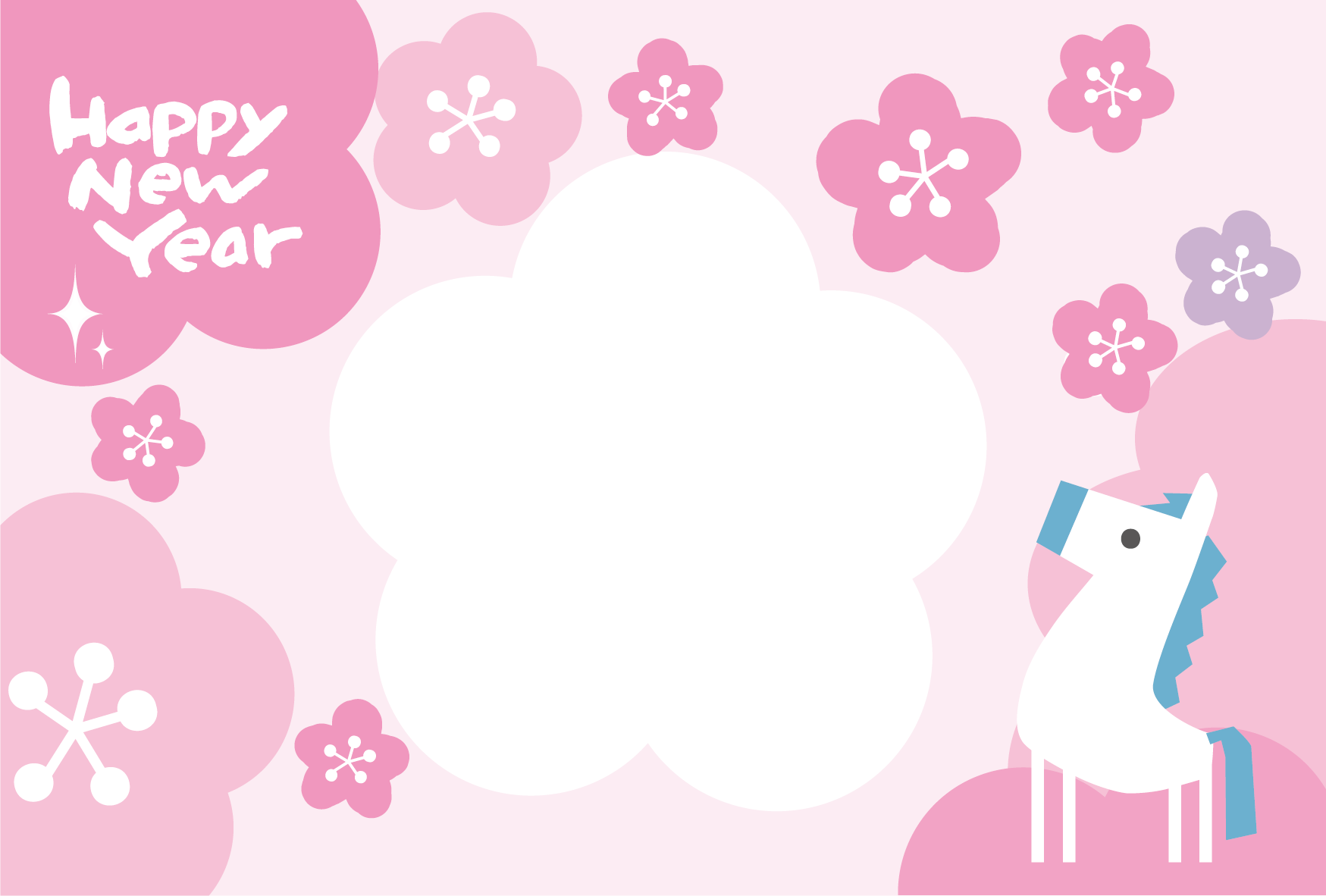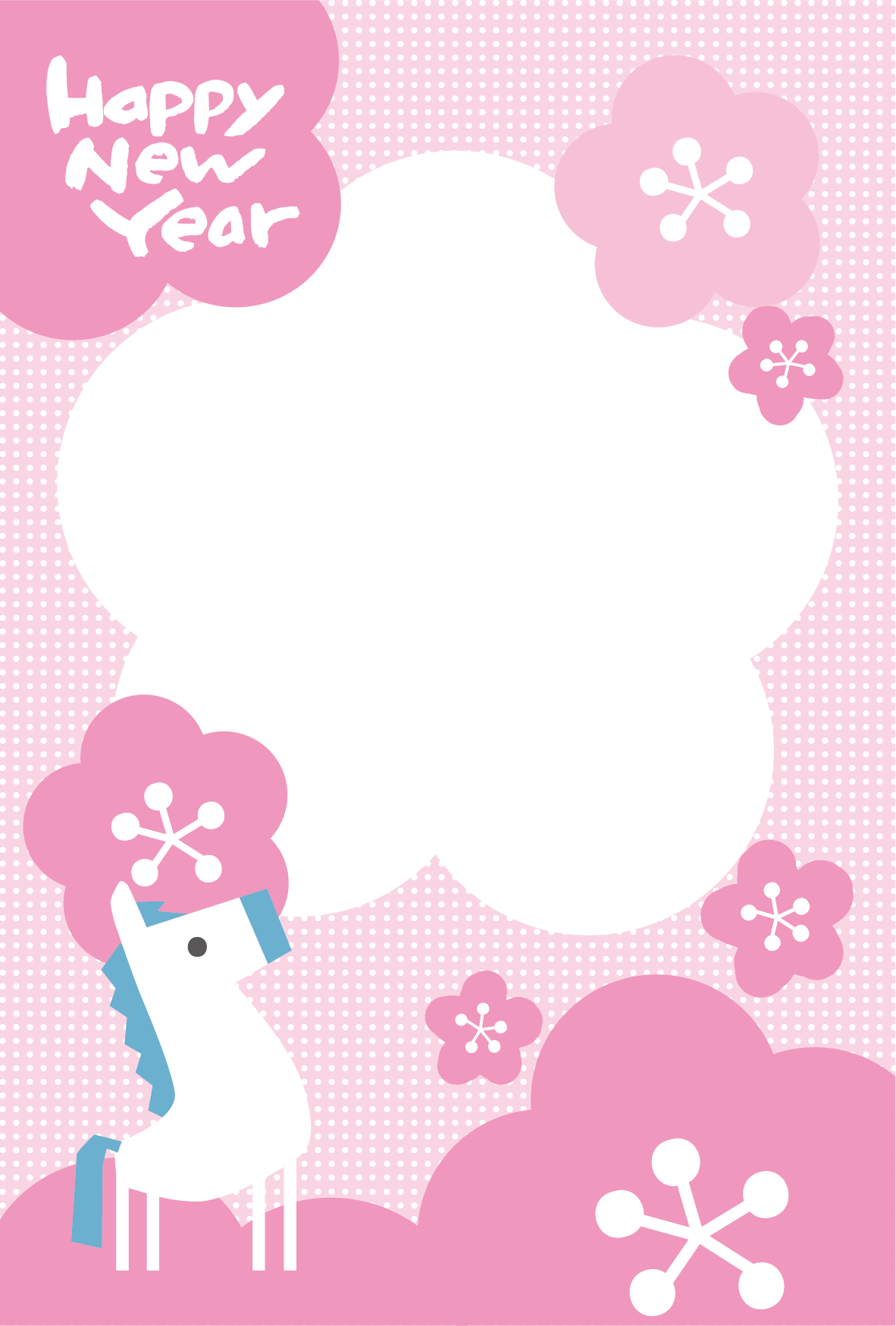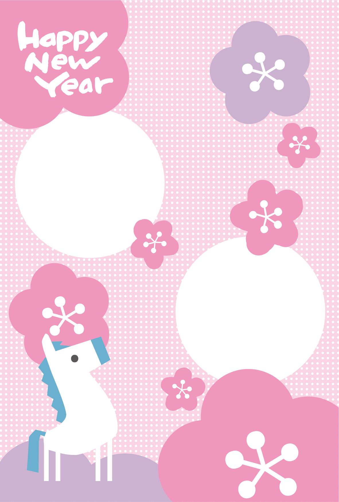 写真を入れて作成できるかわいい干支午年うまのイラストのフォト フレーム年賀状デザインテンプレートが無料(登録不要)でダウンロード出来ます。2026年年賀状印刷用素材(郵便葉書)としてのご使用は個人様はもちろん法人・ビジネス用でも無料でご使用頂けます。ご使用のさいは利用規約を読まれてご使用くださいませ。年賀状印刷用写真フレーム素材は各画像の上でクリック【 別枠で開いた大きな画像 】をダウンロードしてご使用ください。
