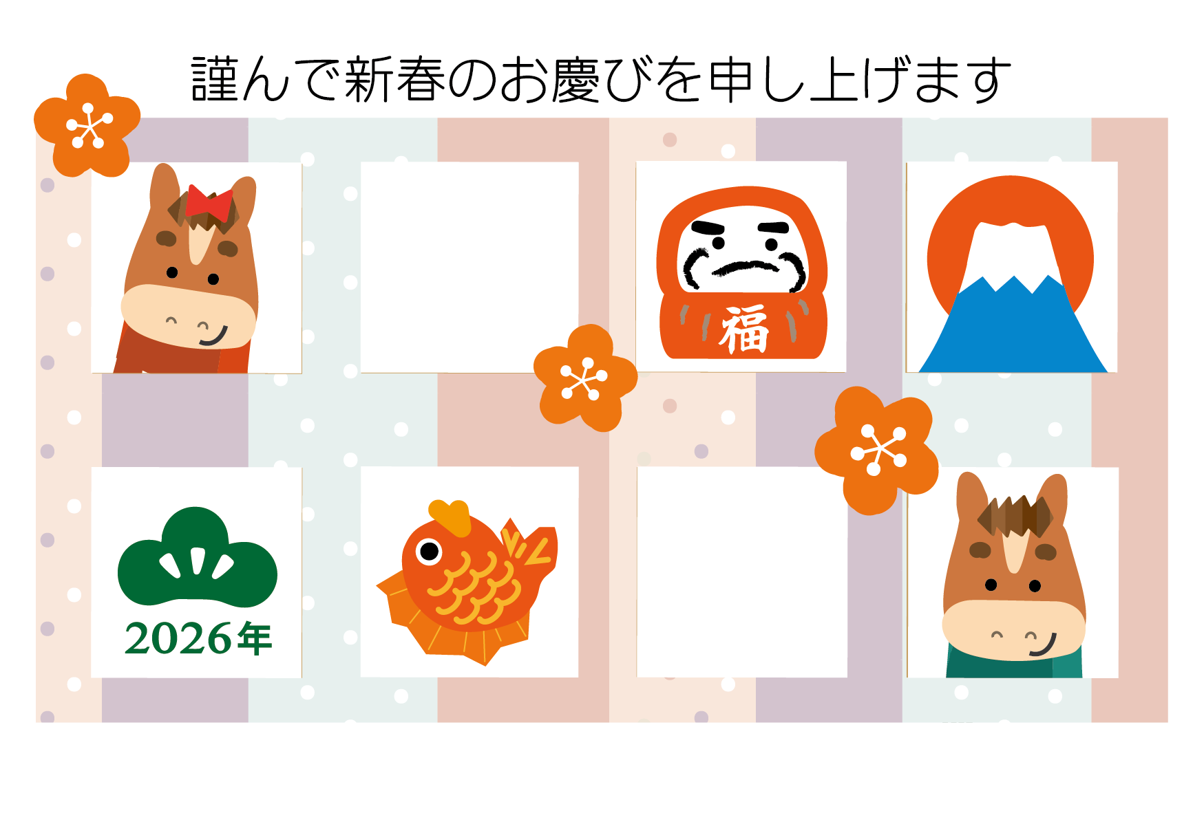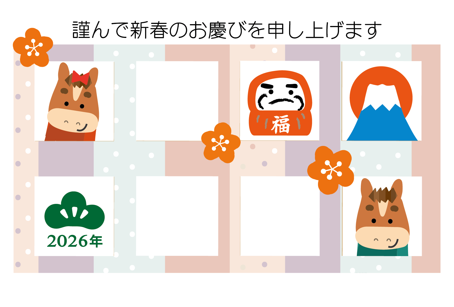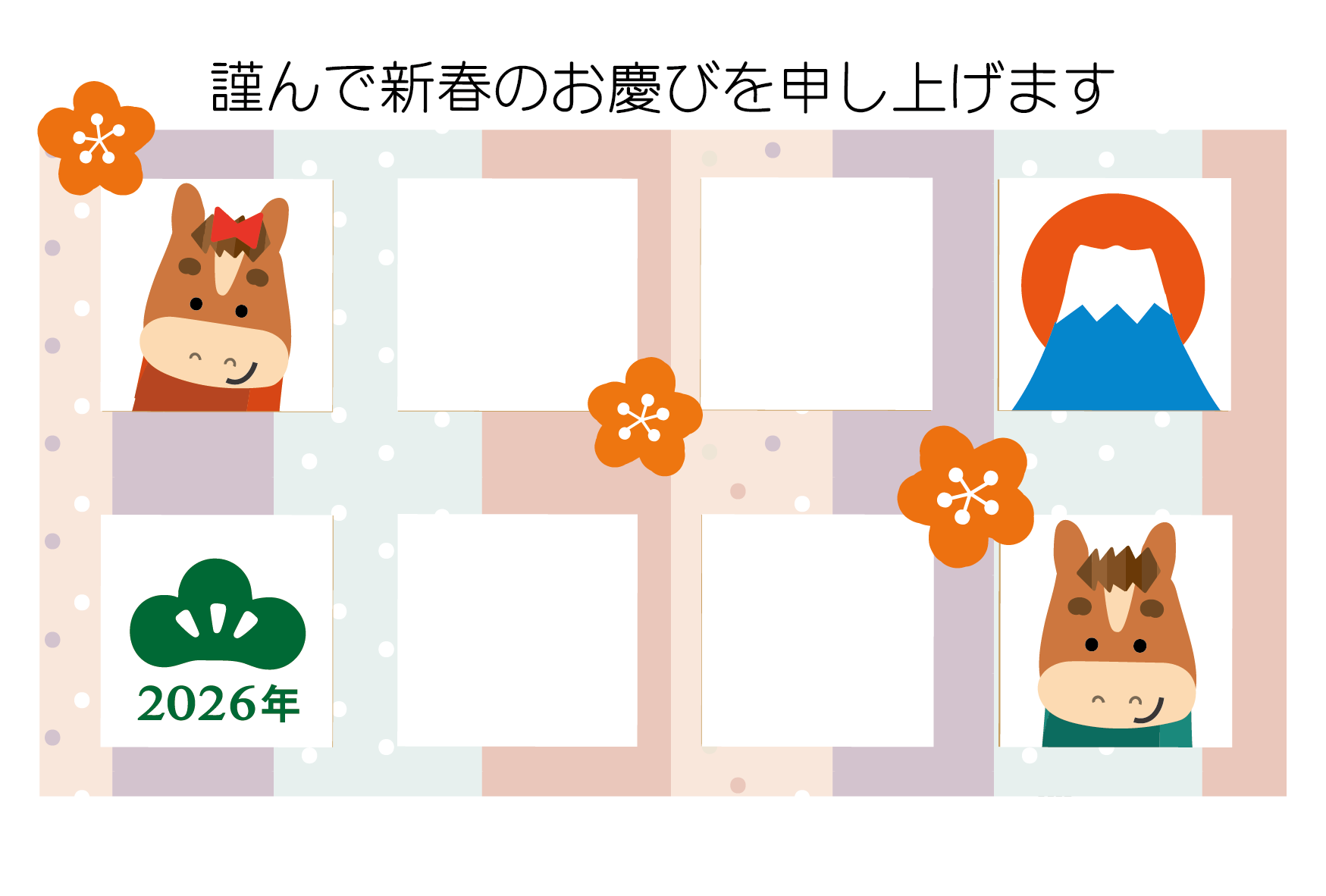 写真を入れて作成できるかわいい干支午年うまのイラストのフォト フレーム年賀状デザインテンプレートが無料(登録不要)でダウンロード出来ます。2026年年賀状印刷用素材(郵便葉書)としてのご使用は個人様はもちろん法人・ビジネス用でも無料でご使用頂けます。ご使用のさいは利用規約を読まれてご使用くださいませ。年賀状印刷用写真フレーム素材は各画像の上でクリック【 別枠で開いた大きな画像 】をダウンロードしてご使用ください。