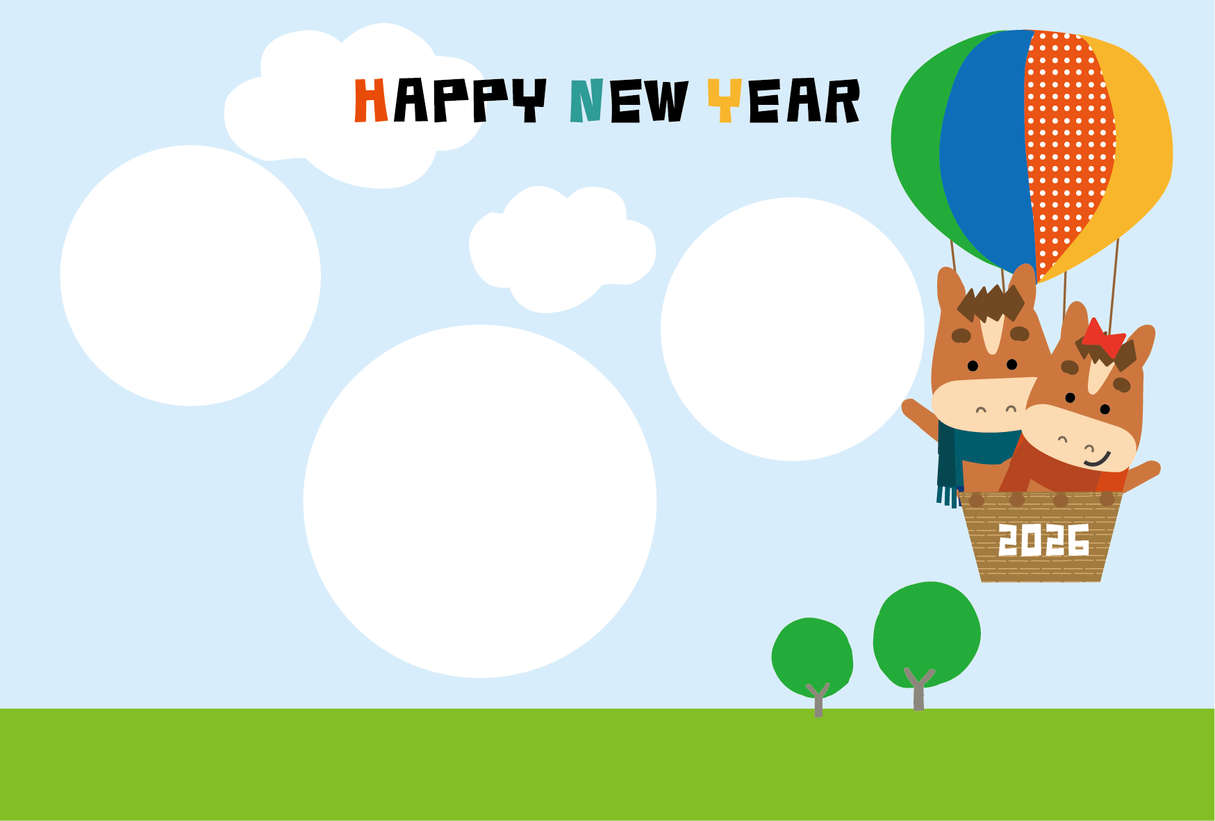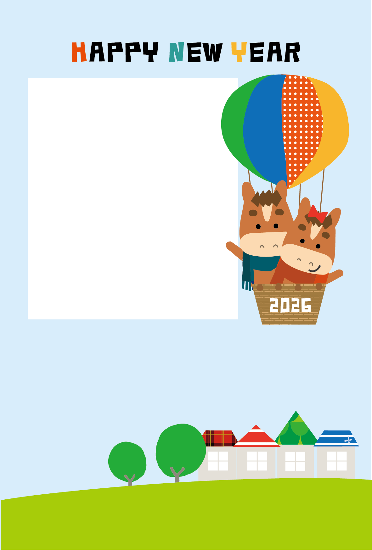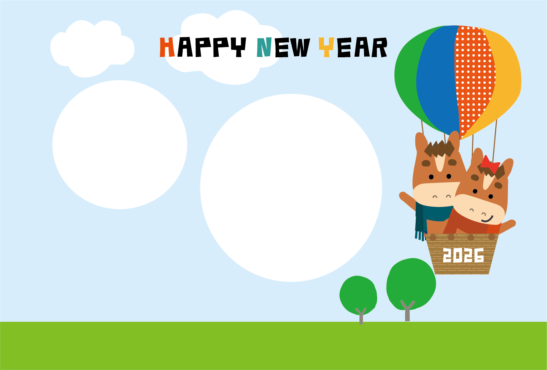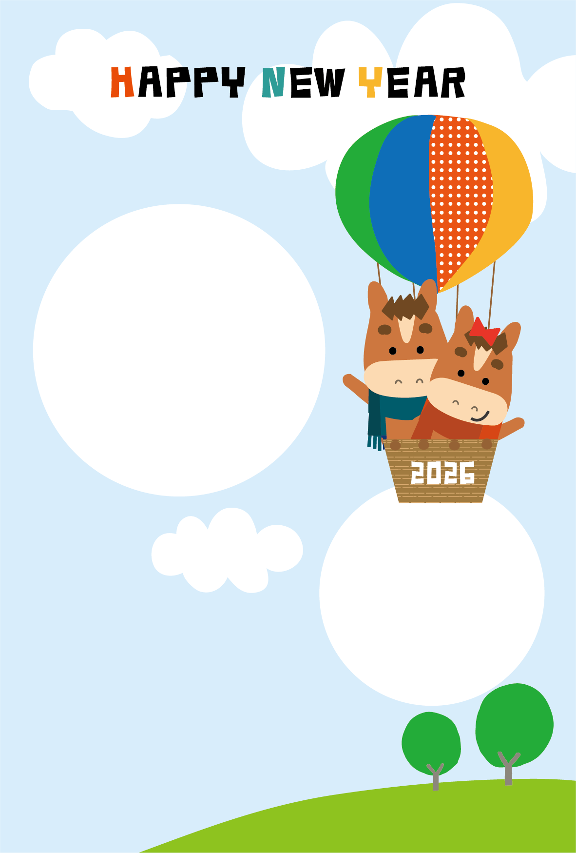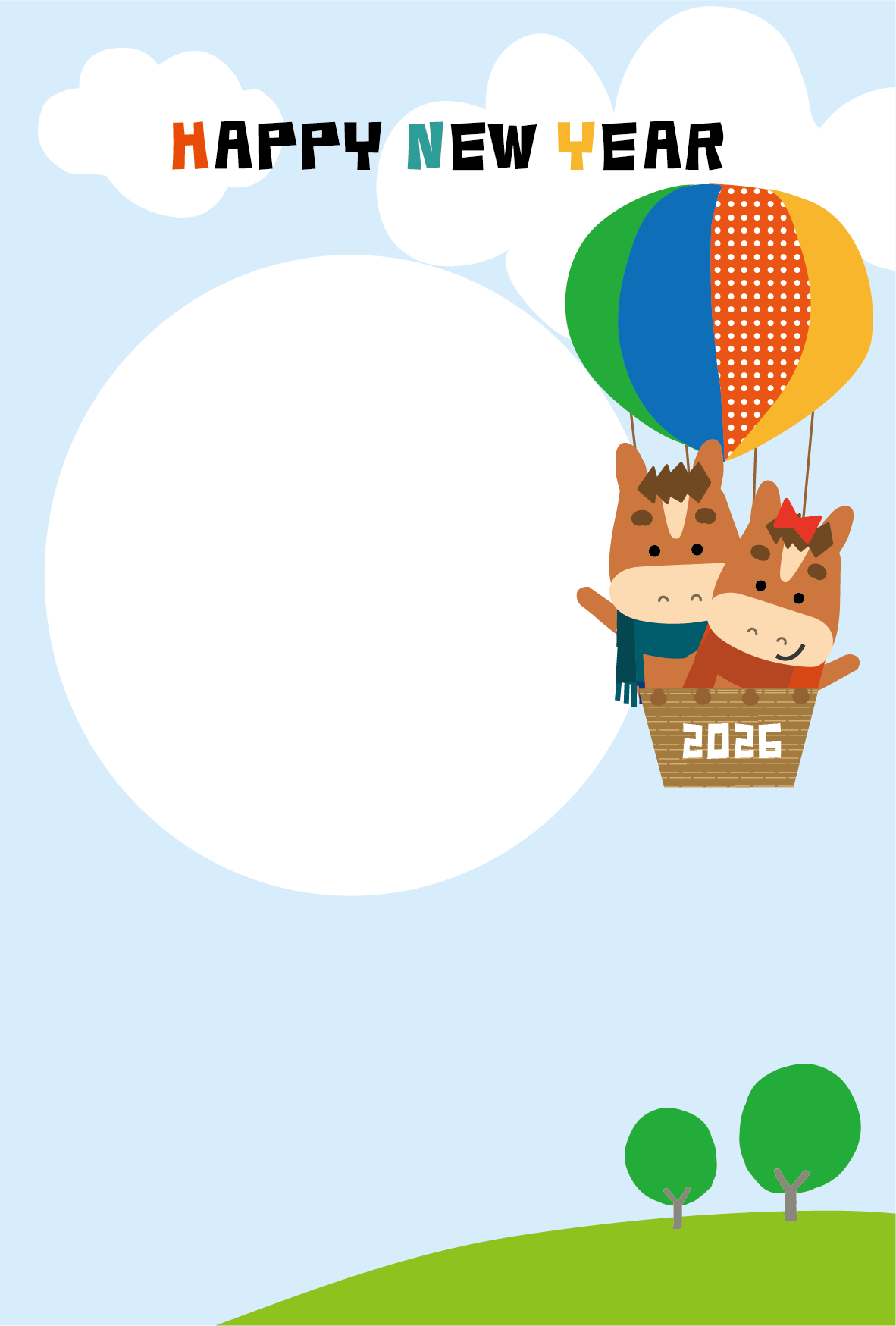 写真を入れて作成できるかわいい干支午年うまのイラストのフォト フレーム年賀状デザインテンプレートが無料(登録不要)でダウンロード出来ます。2026年年賀状印刷用素材(郵便葉書)としてのご使用は個人様はもちろん法人・ビジネス用でも無料でご使用頂けます。ご使用のさいは利用規約を読まれてご使用くださいませ。年賀状印刷用写真フレーム素材は各画像の上でクリック【 別枠で開いた大きな画像 】をダウンロードしてご使用ください。