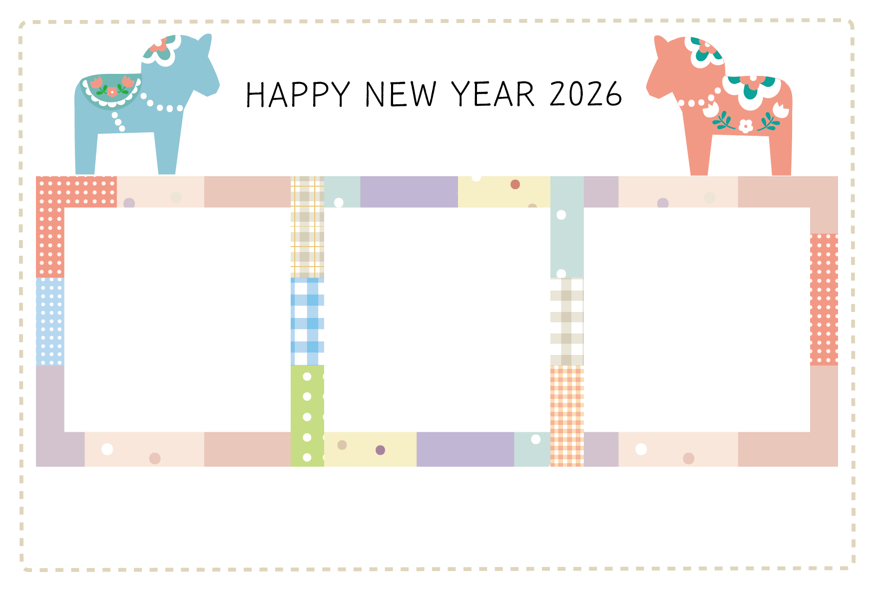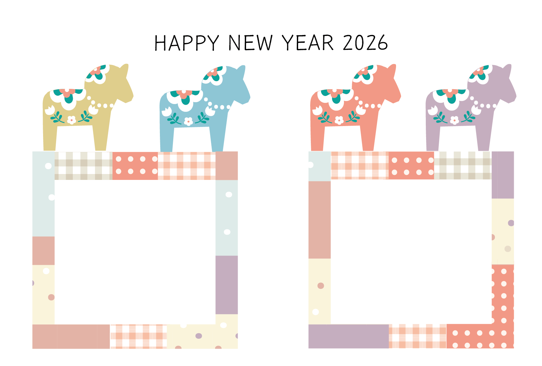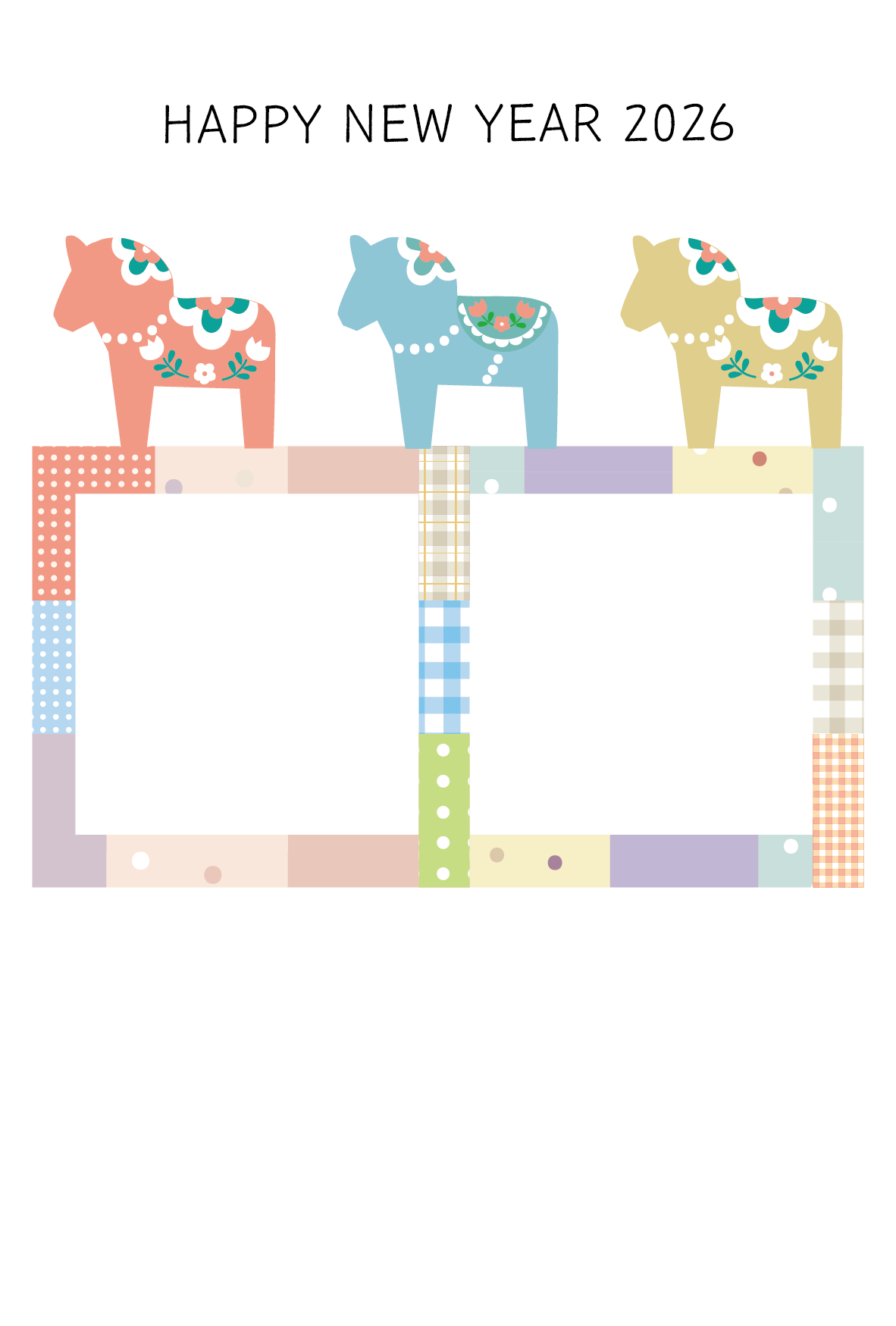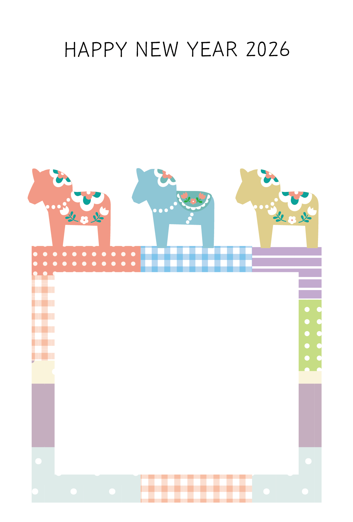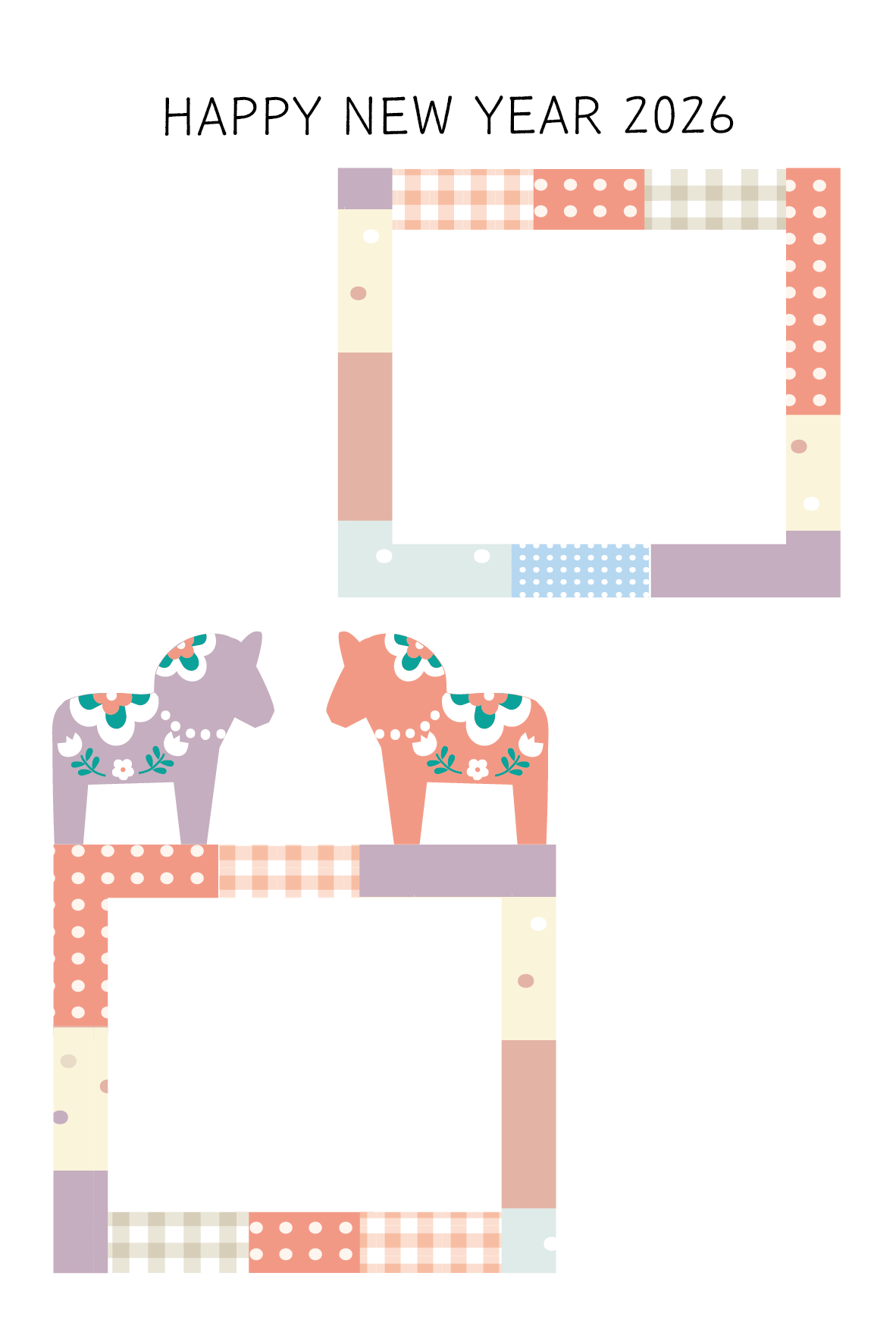 写真を入れて作成できるかわいい干支午年うまのイラストのフォト フレーム年賀状デザインテンプレートが無料(登録不要)でダウンロード出来ます。2026年年賀状印刷用素材(郵便葉書)としてのご使用は個人様はもちろん法人・ビジネス用でも無料でご使用頂けます。ご使用のさいは利用規約を読まれてご使用くださいませ。年賀状印刷用写真フレーム素材は各画像の上でクリック【 別枠で開いた大きな画像 】をダウンロードしてご使用ください。