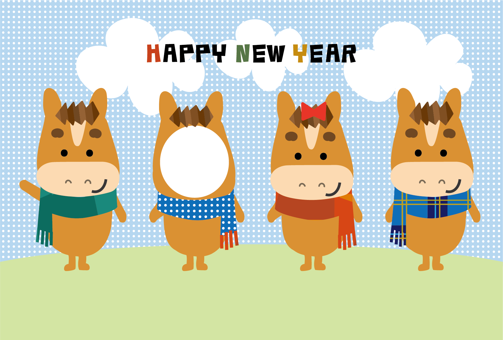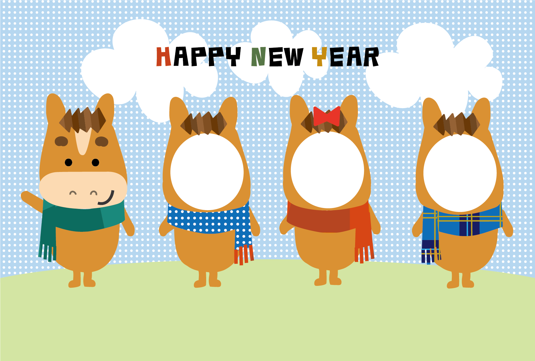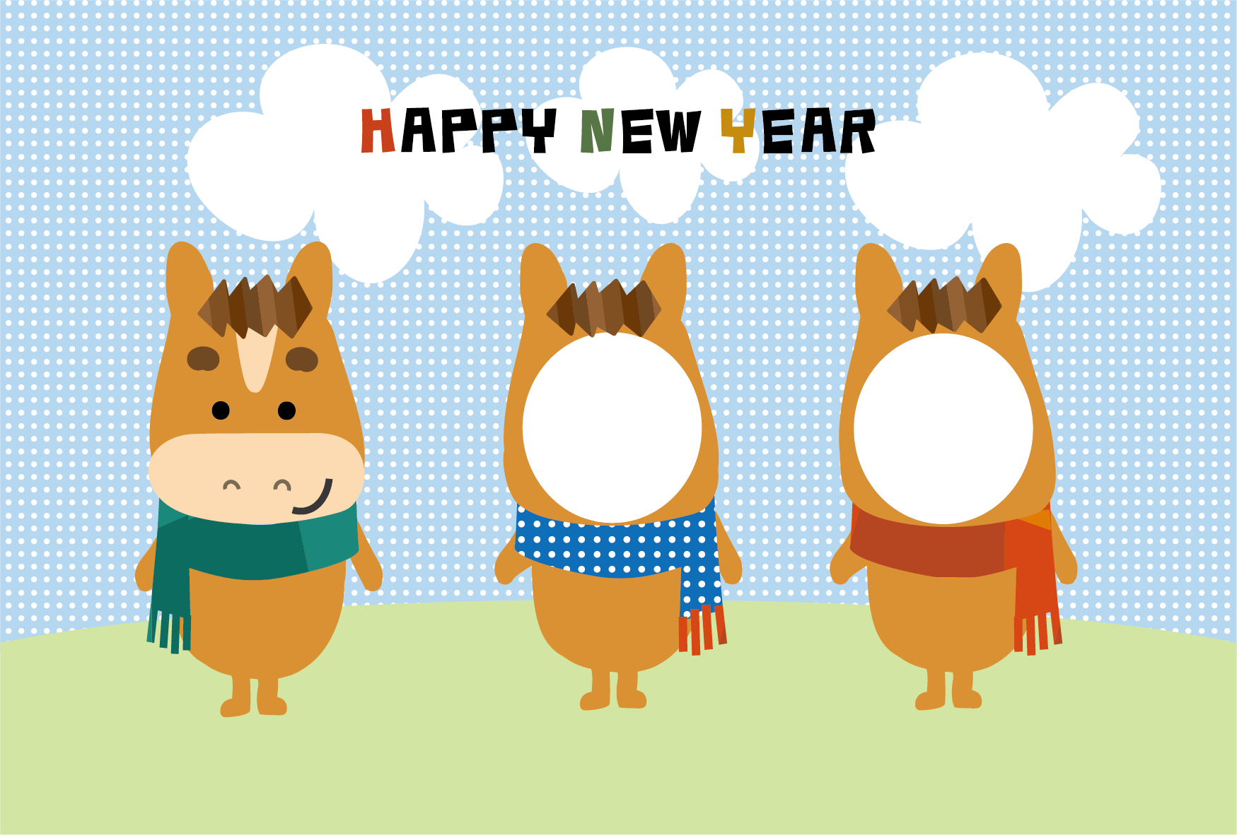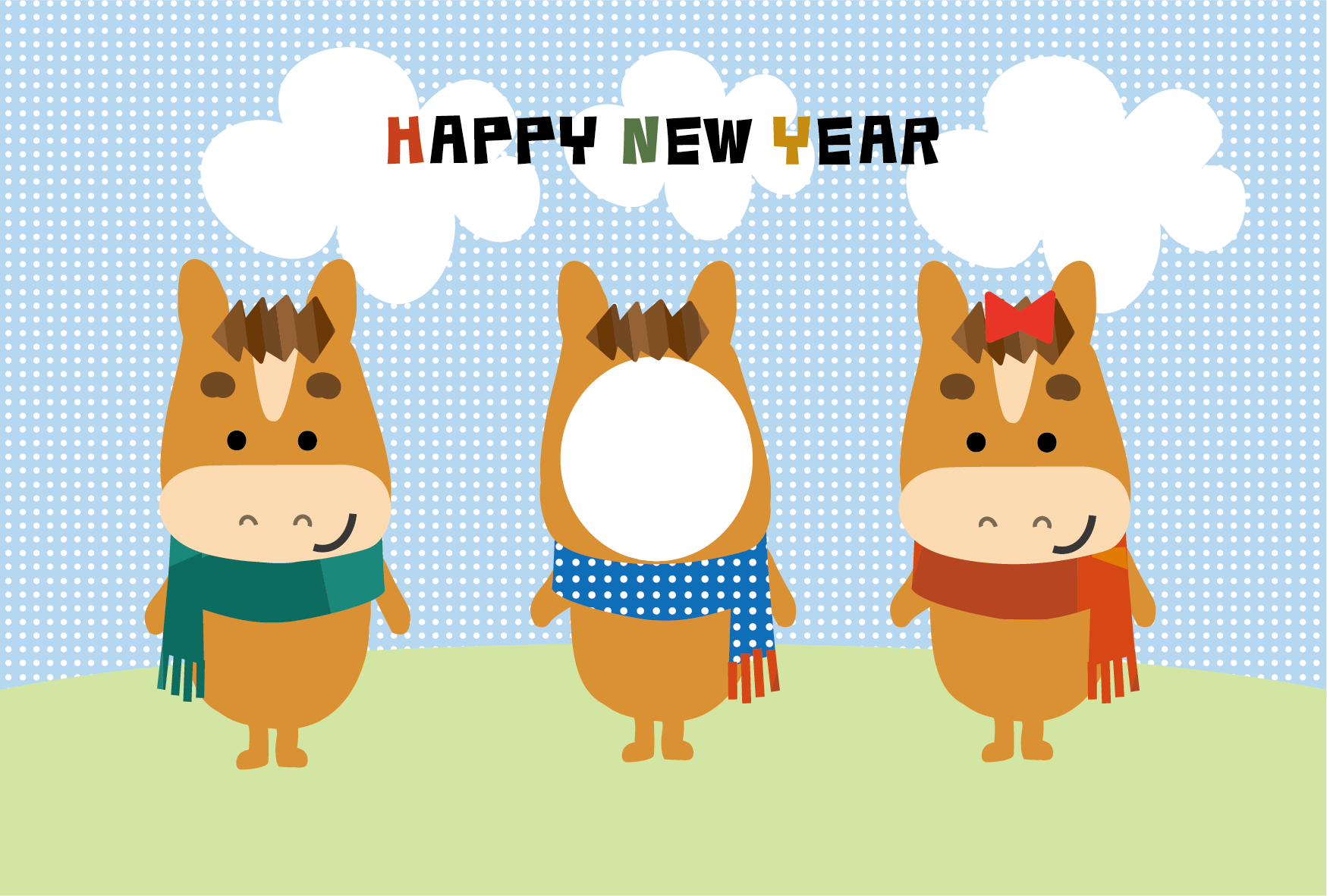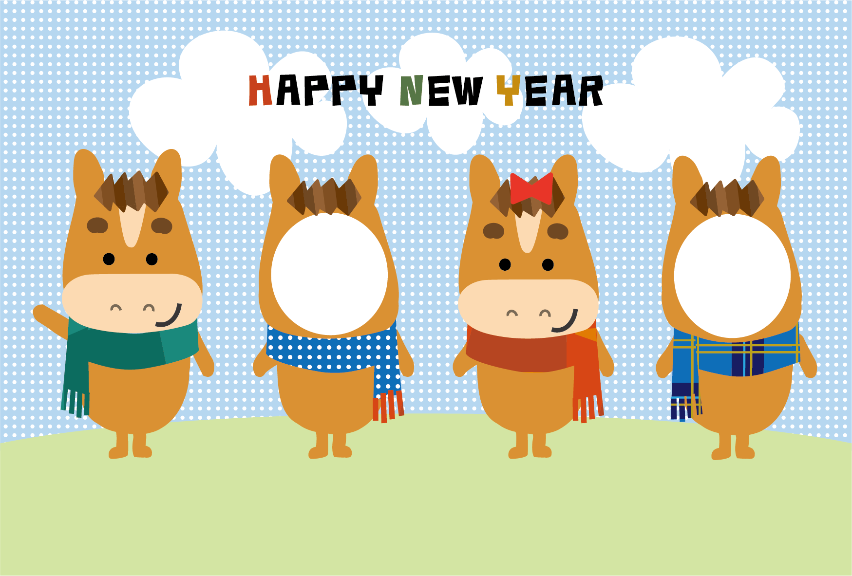 写真を入れて作成できるかわいい干支午年うまのイラストのフォト フレーム年賀状デザインテンプレートが無料(登録不要)でダウンロード出来ます。2026年年賀状印刷用素材(郵便葉書)としてのご使用は個人様はもちろん法人・ビジネス用でも無料でご使用頂けます。ご使用のさいは利用規約を読まれてご使用くださいませ。年賀状印刷用写真フレーム素材は各画像の上でクリック【 別枠で開いた大きな画像 】をダウンロードしてご使用ください。