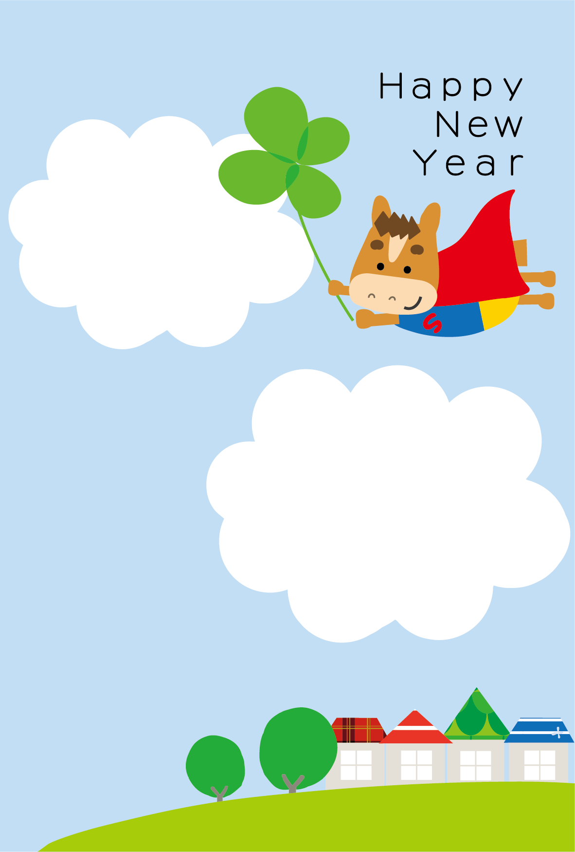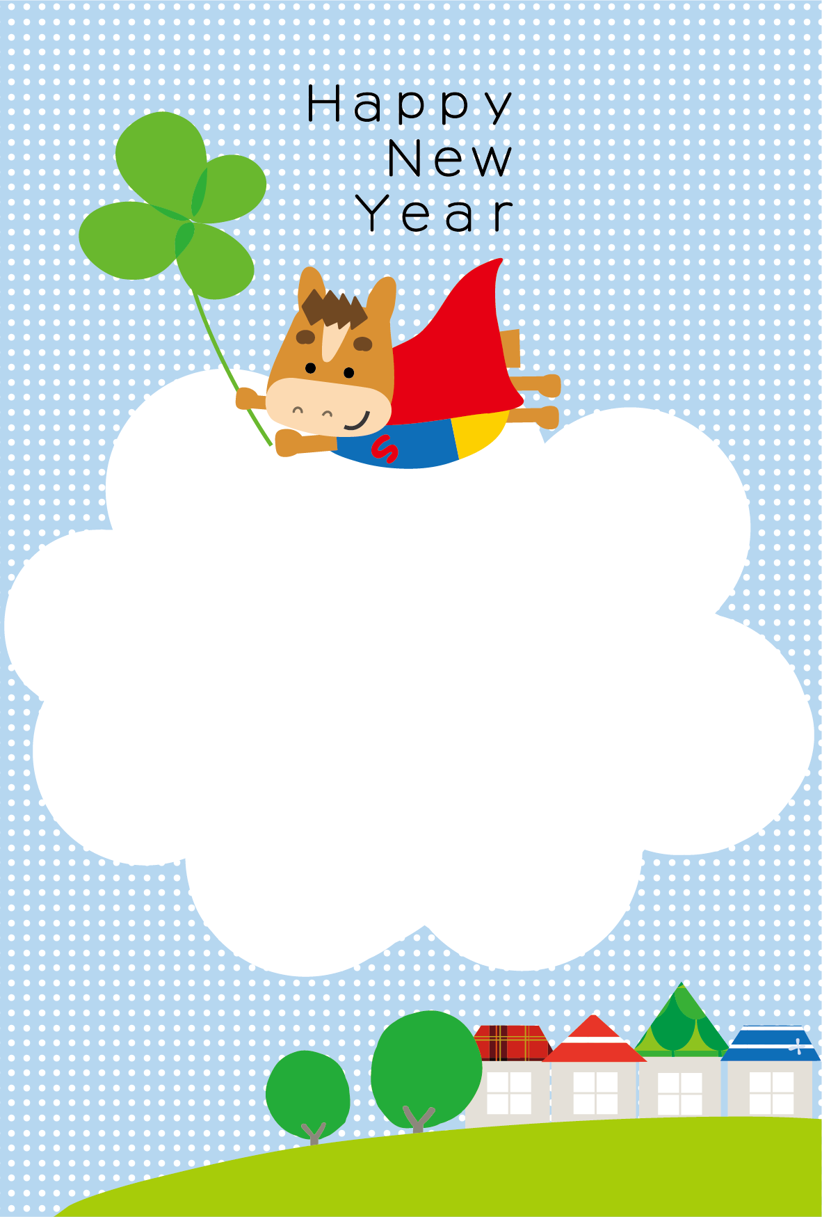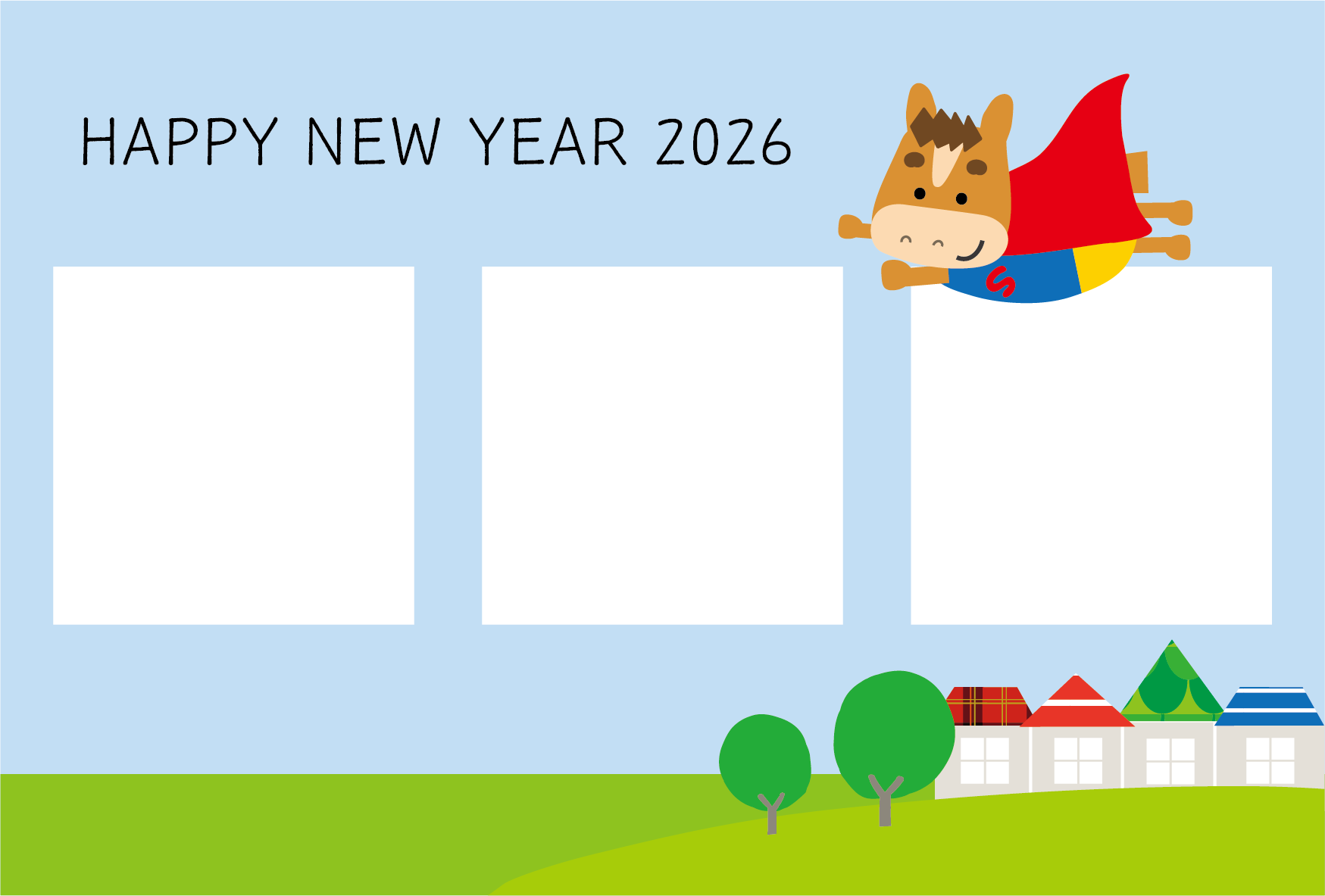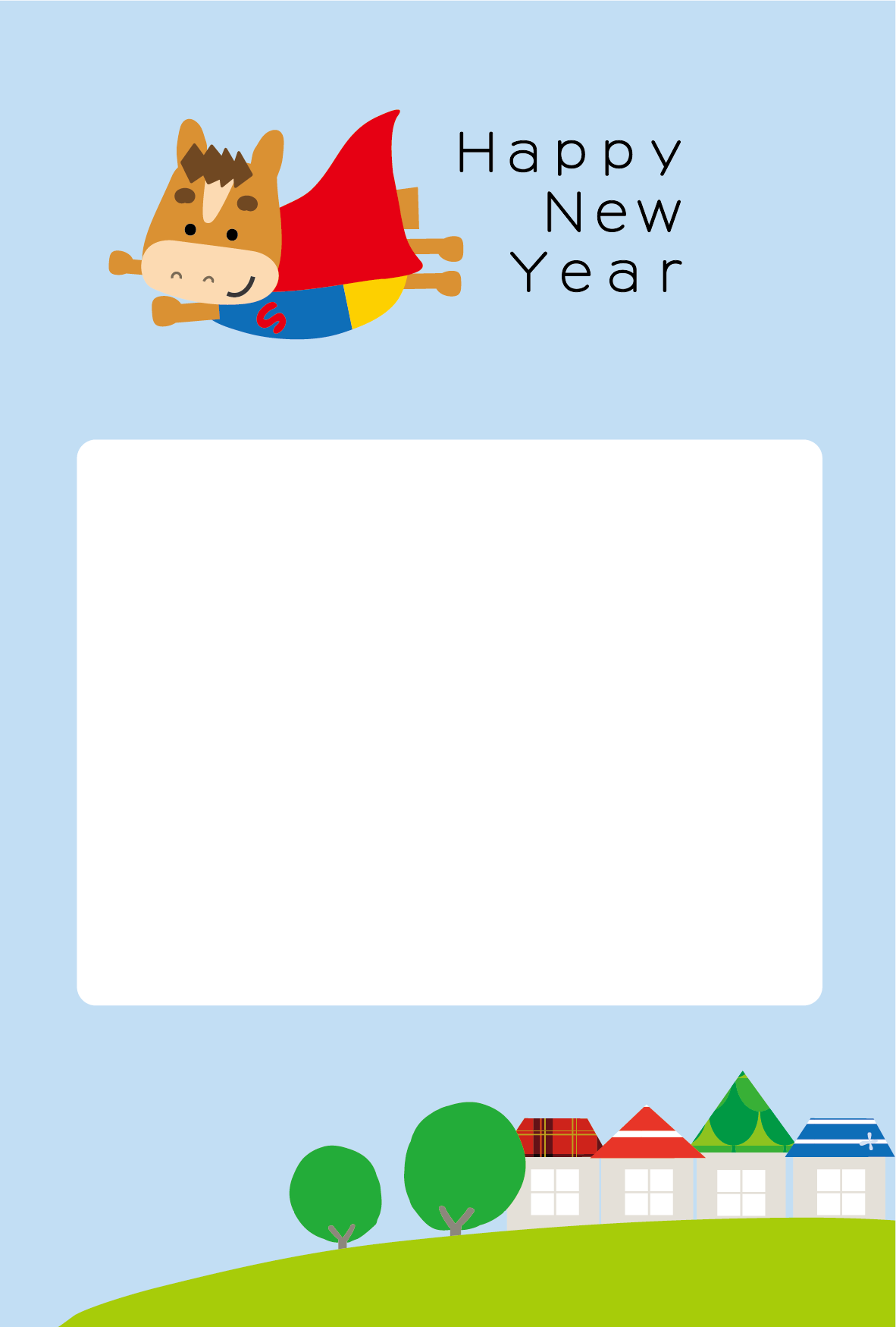 写真を入れて作成できるかわいい干支午年うまのイラストのフォト フレーム年賀状デザインテンプレートが無料(登録不要)でダウンロード出来ます。2026年年賀状印刷用素材(郵便葉書)としてのご使用は個人様はもちろん法人・ビジネス用でも無料でご使用頂けます。ご使用のさいは利用規約を読まれてご使用くださいませ。年賀状印刷用写真フレーム素材は各画像の上でクリック【 別枠で開いた大きな画像 】をダウンロードしてご使用ください。