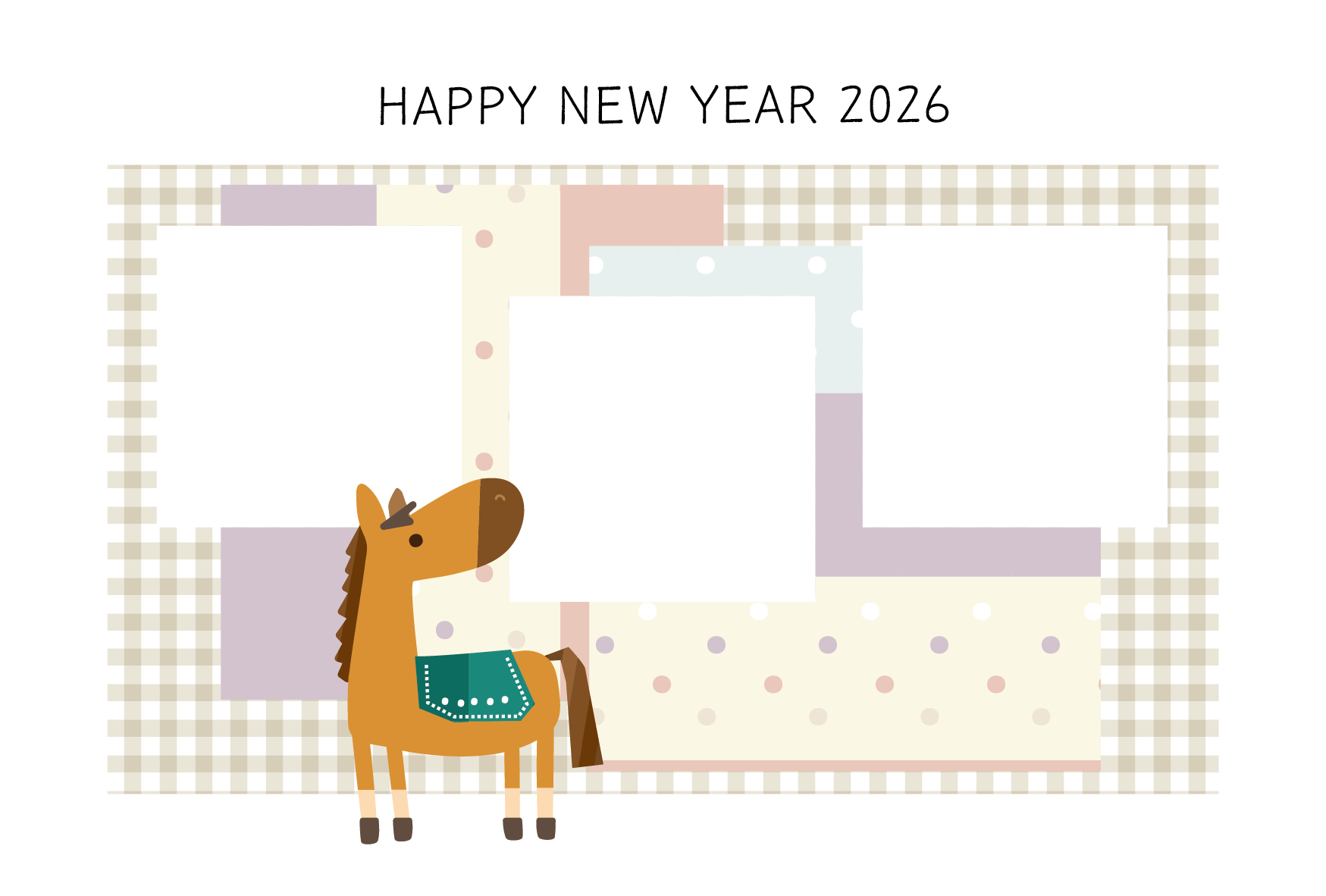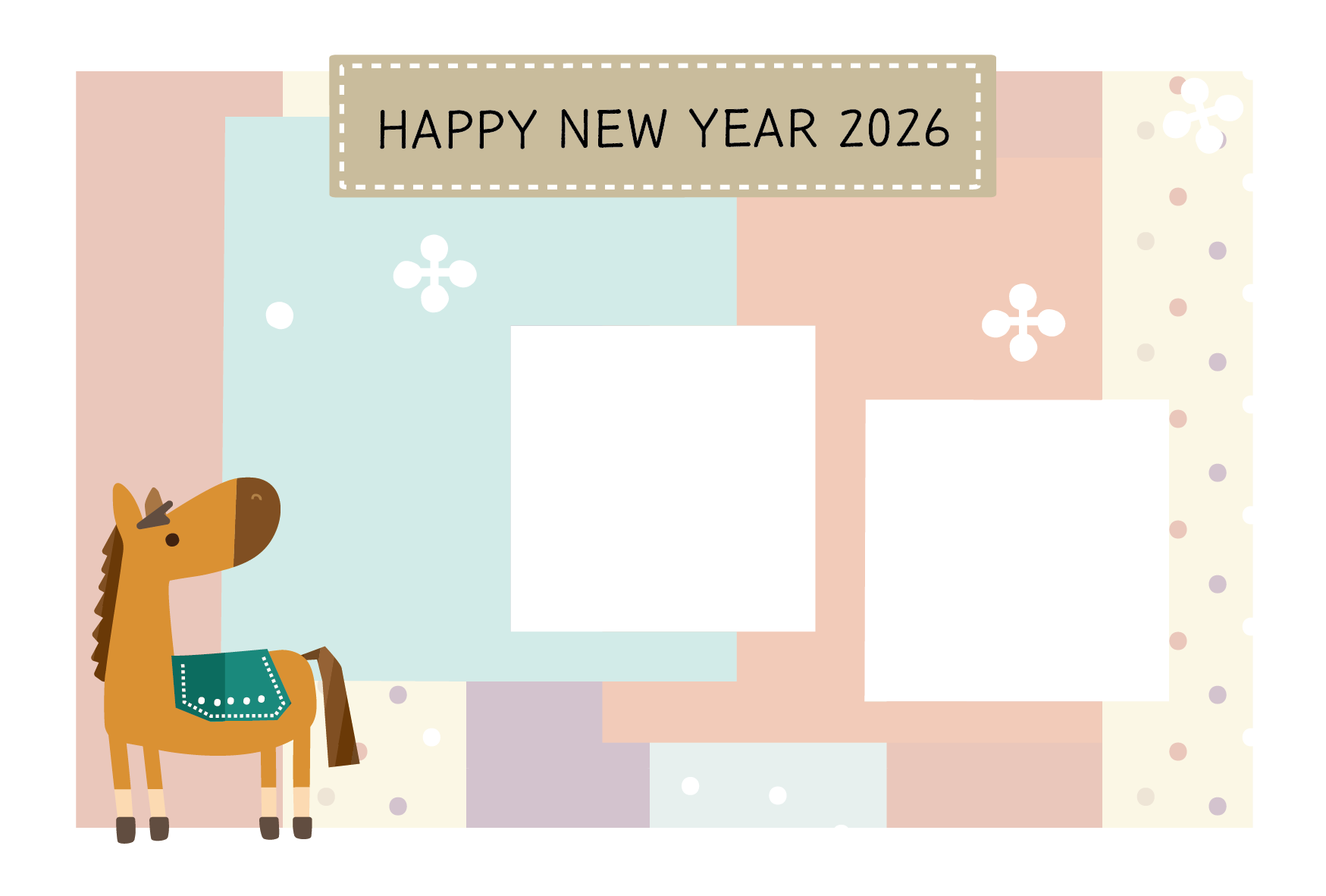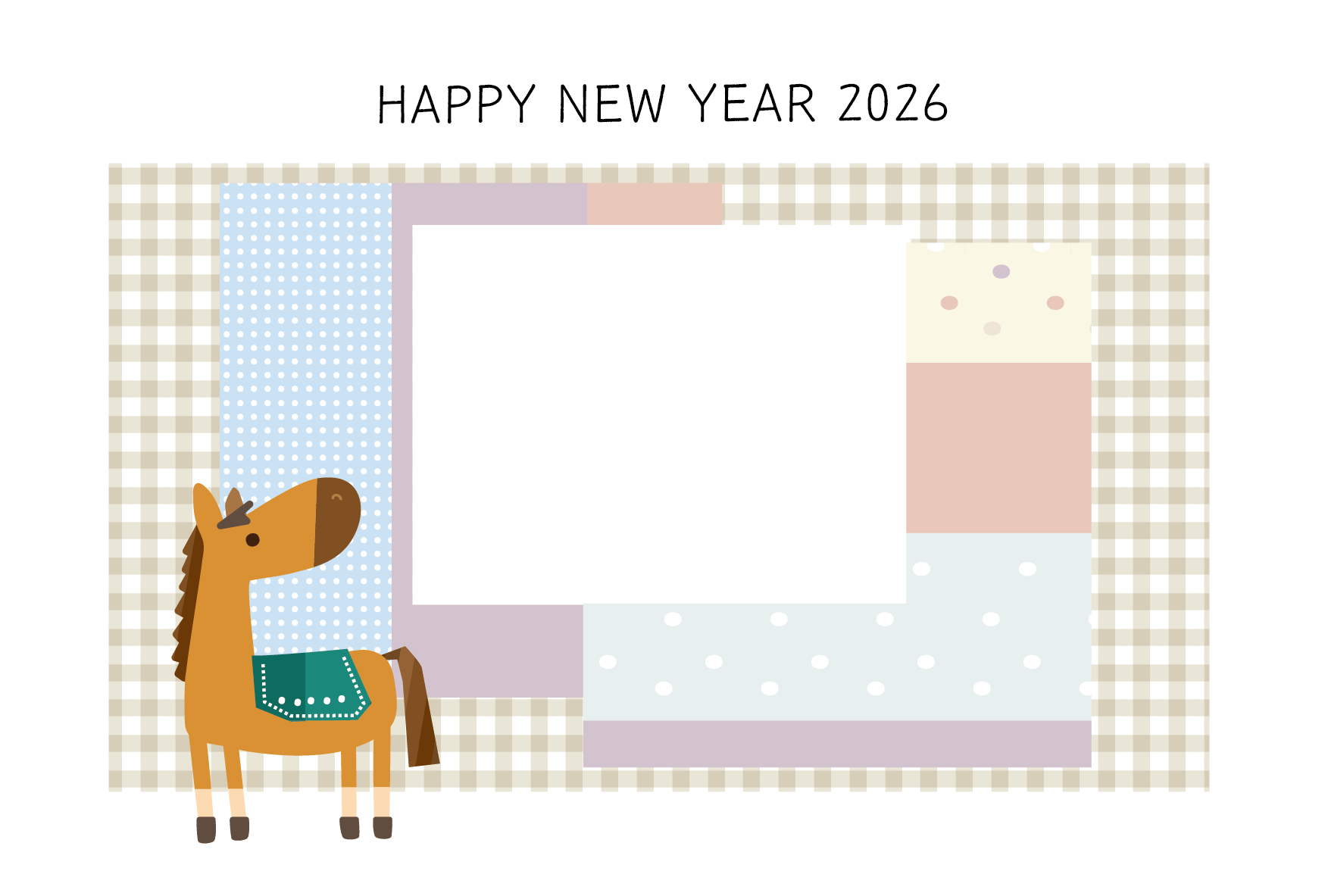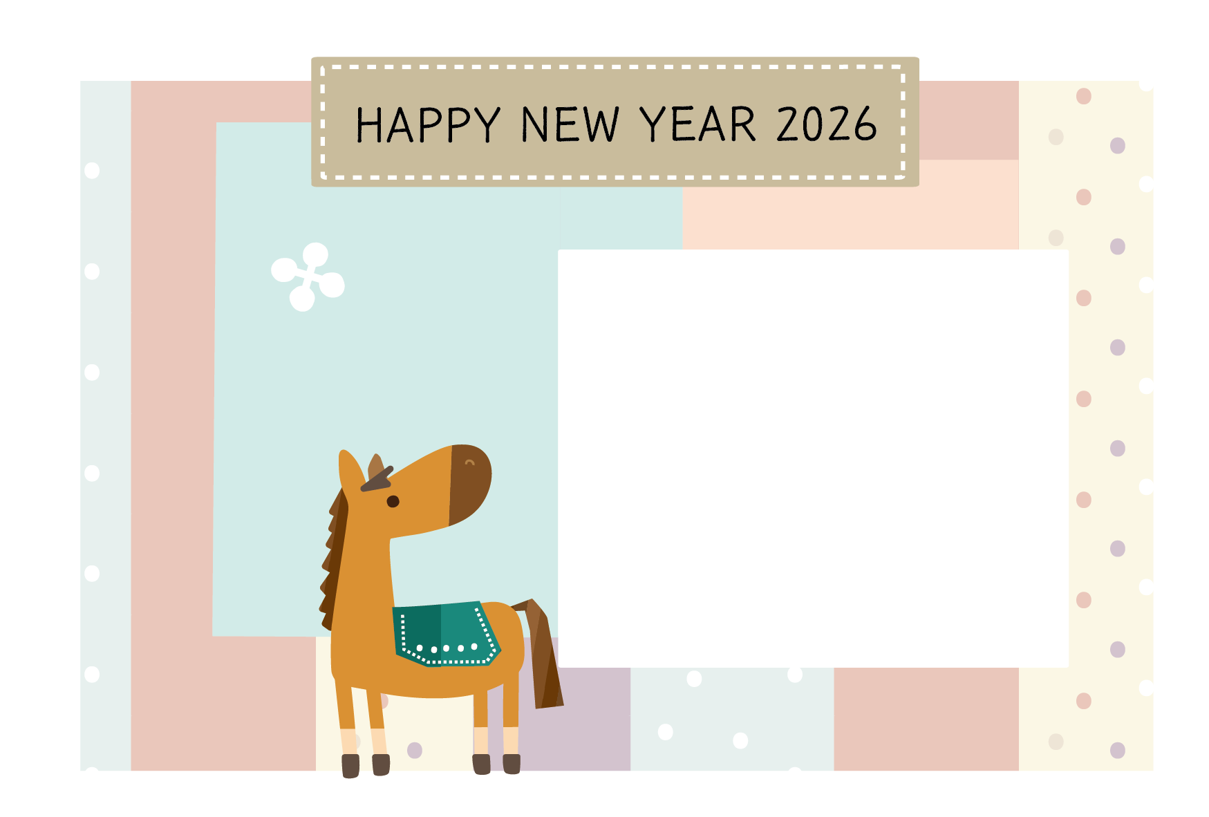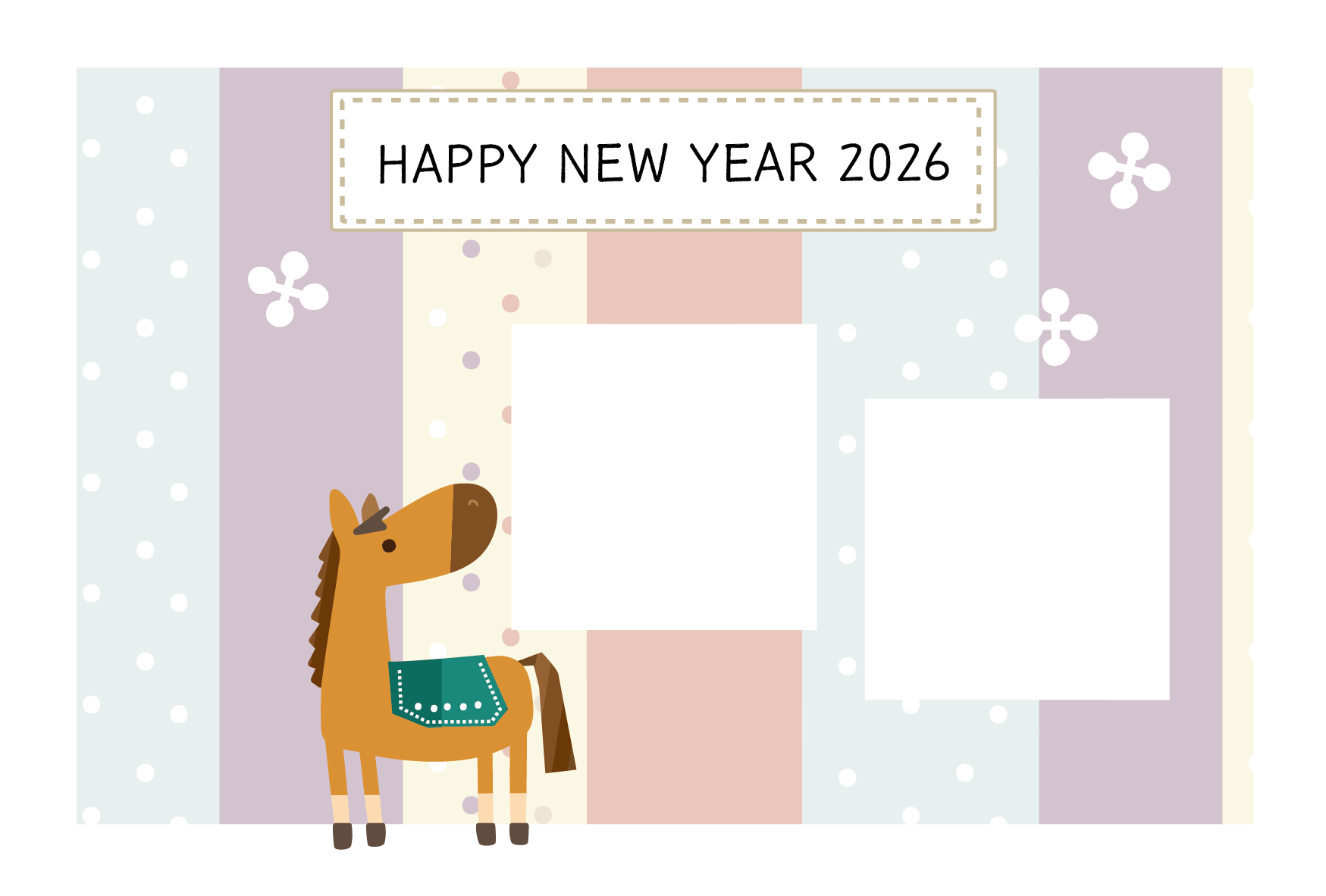 写真を入れて作成できるかわいい干支午年うまのイラストのフォト フレーム年賀状デザインテンプレートが無料(登録不要)でダウンロード出来ます。2026年年賀状印刷用素材(郵便葉書)としてのご使用は個人様はもちろん法人・ビジネス用でも無料でご使用頂けます。ご使用のさいは利用規約を読まれてご使用くださいませ。年賀状印刷用写真フレーム素材は各画像の上でクリック【 別枠で開いた大きな画像 】をダウンロードしてご使用ください。