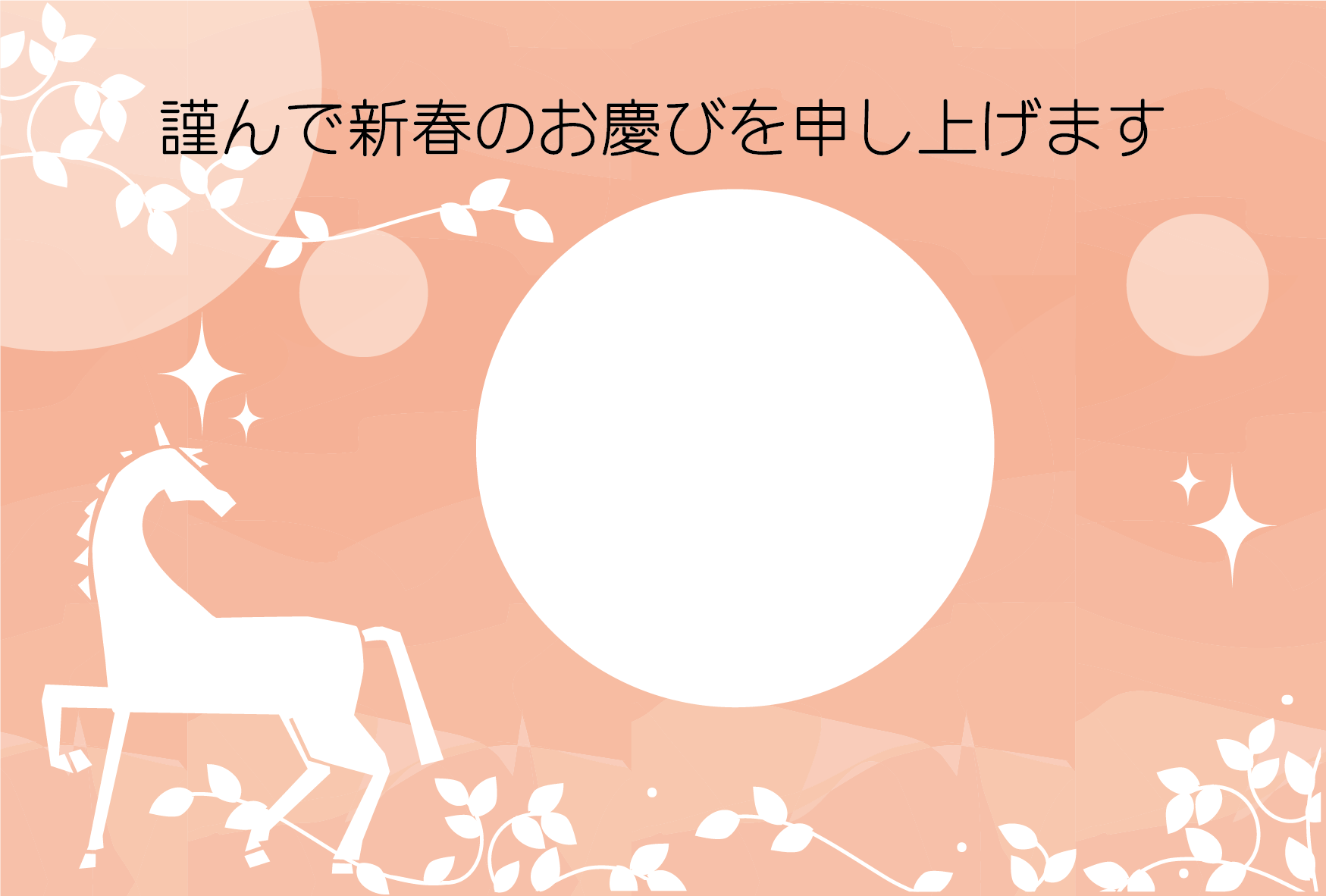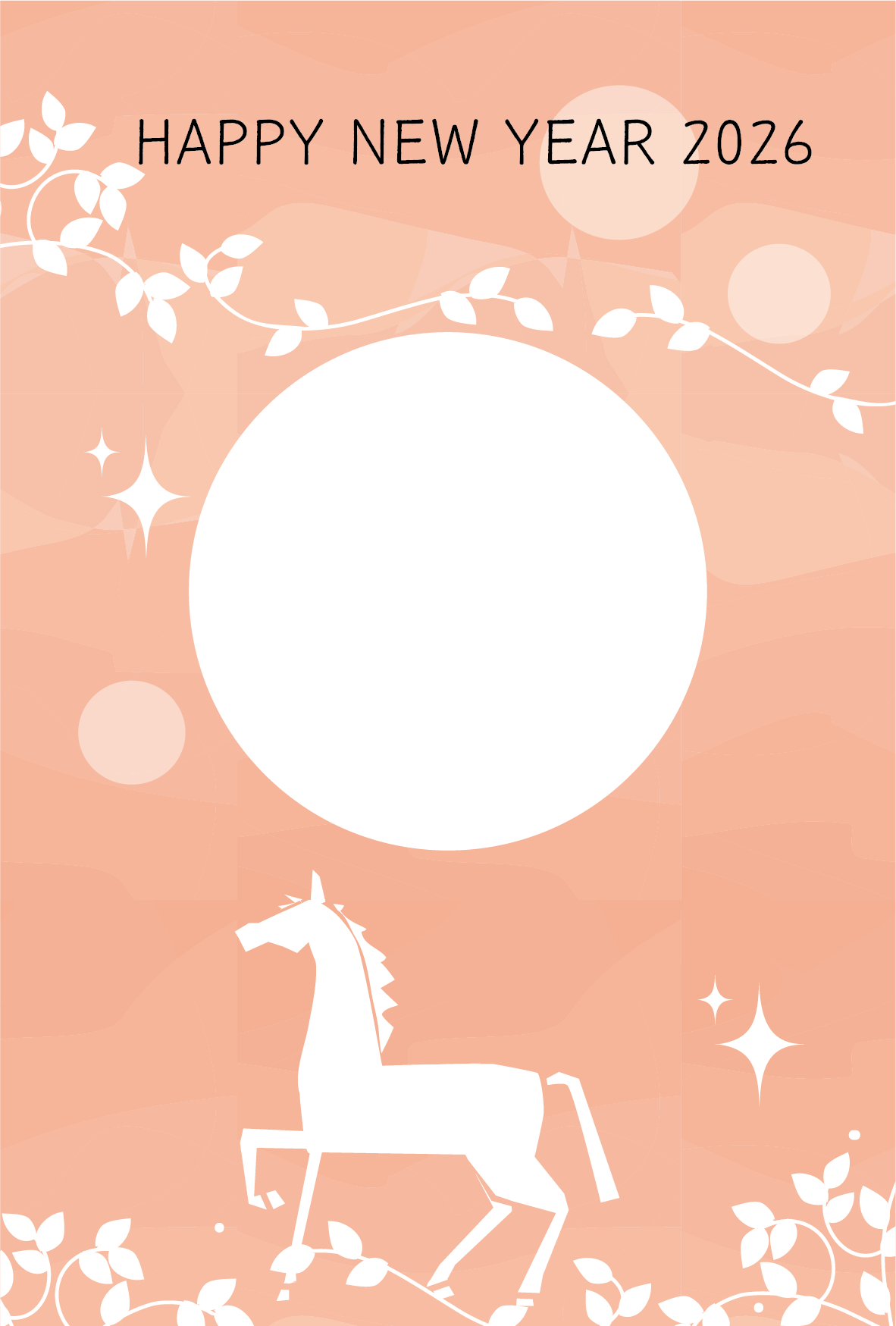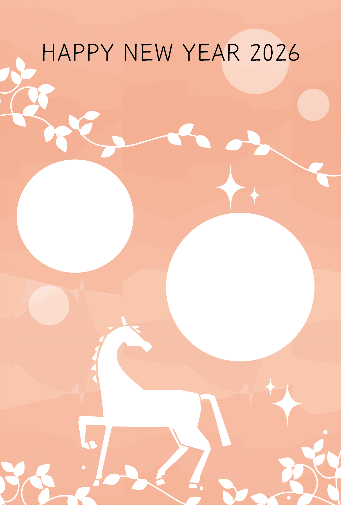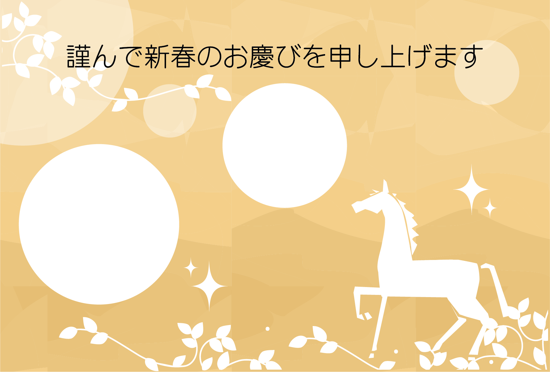 写真を入れて作成できるかわいい干支午年うまのイラストのフォト フレーム年賀状デザインテンプレートが無料(登録不要)でダウンロード出来ます。2026年年賀状印刷用素材(郵便葉書)としてのご使用は個人様はもちろん法人・ビジネス用でも無料でご使用頂けます。ご使用のさいは利用規約を読まれてご使用くださいませ。年賀状印刷用写真フレーム素材は各画像の上でクリック【 別枠で開いた大きな画像 】をダウンロードしてご使用ください。